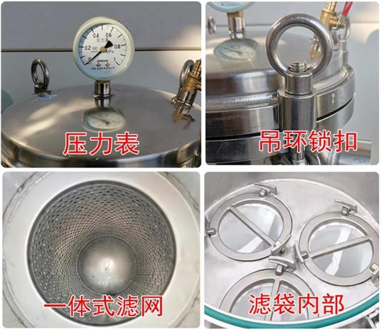 袋式過(guò)濾器是一種壓力式過(guò)濾裝置,主要由過(guò)濾筒體、過(guò)濾筒蓋和快開(kāi)機(jī)構(gòu)、不銹鋼濾袋加強(qiáng)網(wǎng)等主要部件組成,濾液由過(guò)濾器外殼的旁側(cè)入口管流入濾袋,濾袋本身是裝置在加強(qiáng)網(wǎng)籃內(nèi),液體滲透過(guò)所需要細(xì)度等級(jí)的濾袋即可獲得合格的濾液。